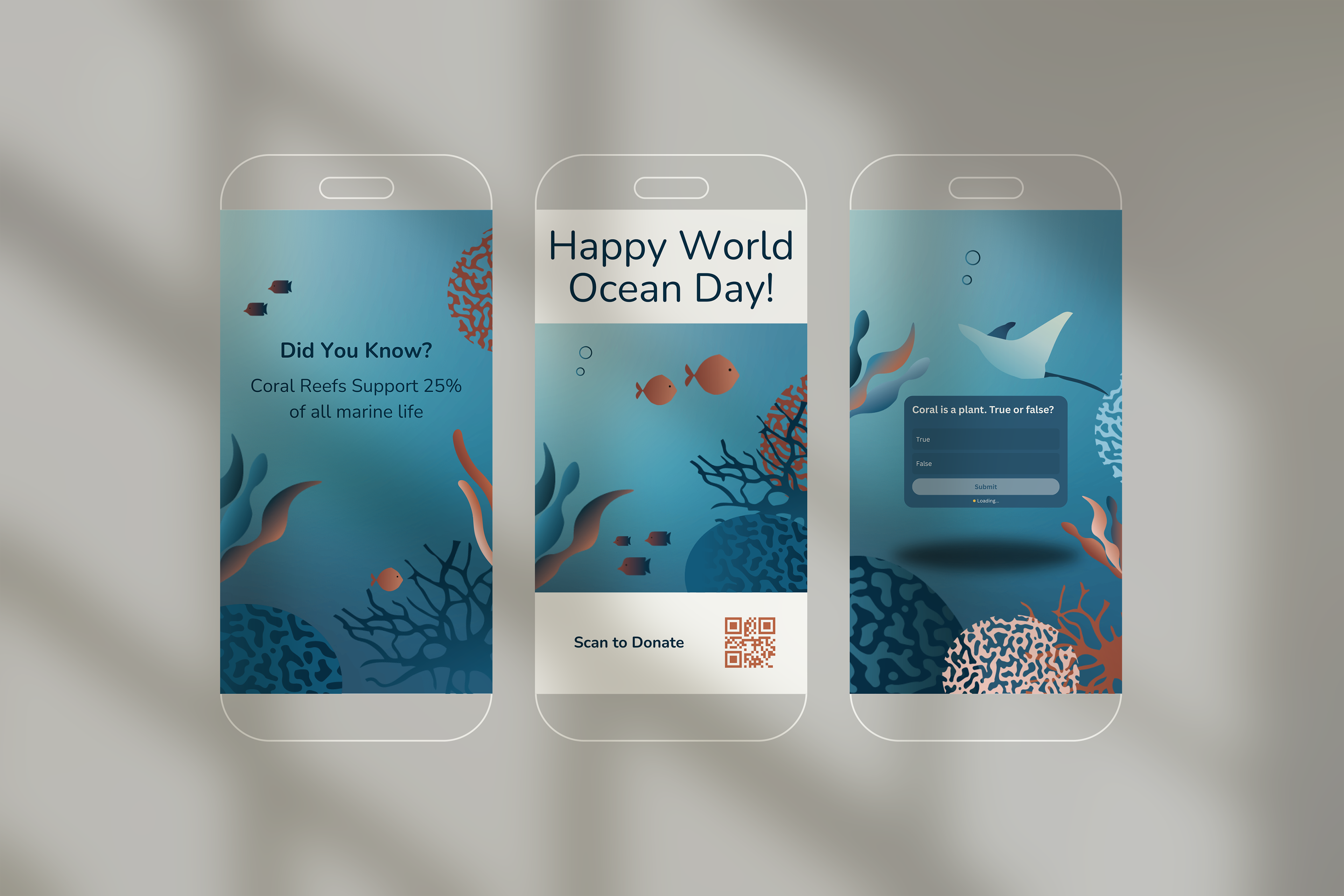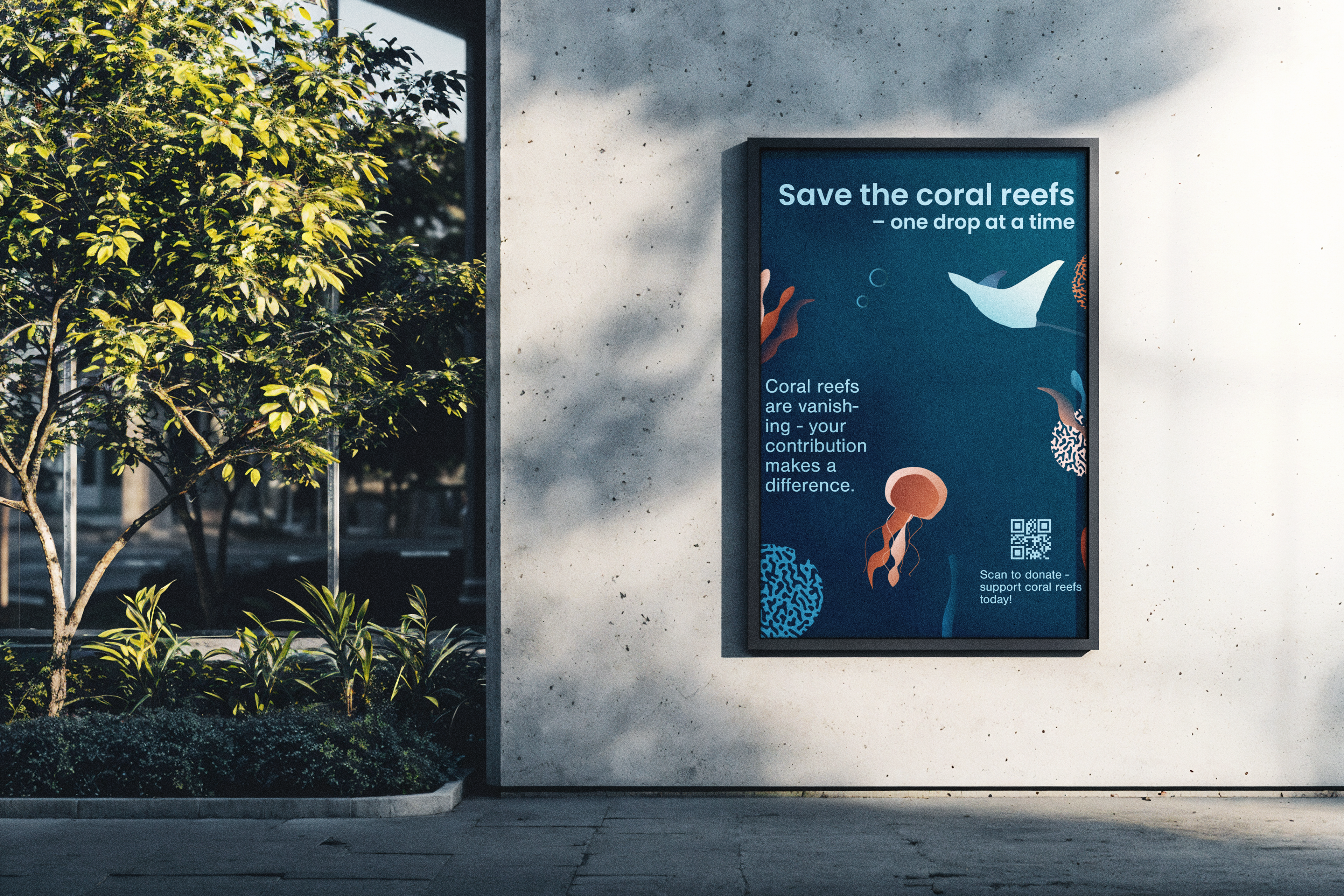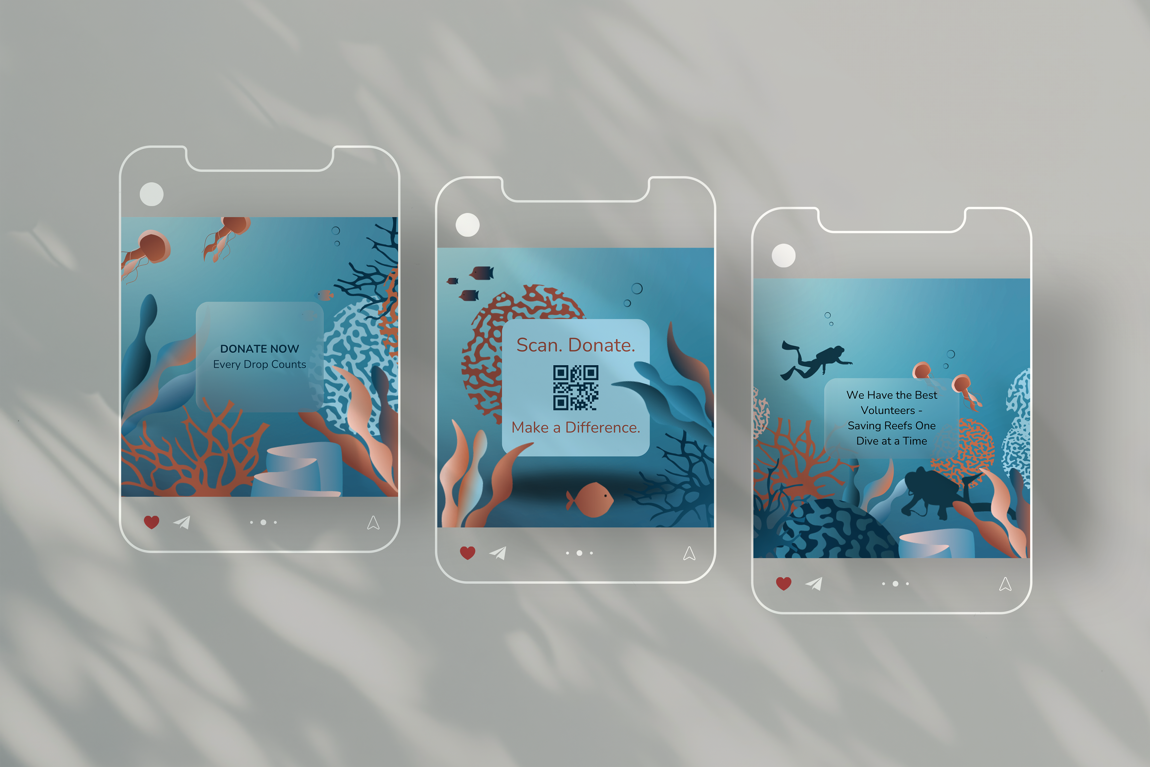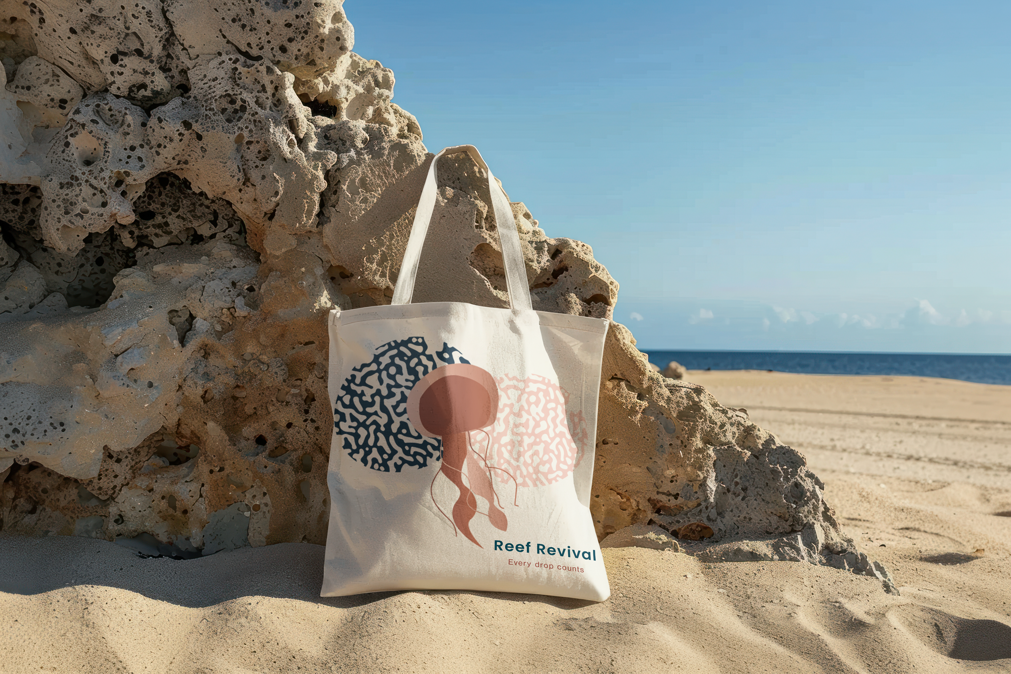 Reef Revival is a conceptual NGO campaign dedicated to coral reef conservation and environmental awareness. The challenge was to capture both the beauty and fragility of marine life while motivating people to act — to care, share, and contribute. The campaign’s identity draws on the rhythm of the ocean: blue depths contrasted with coral tones, elegant typography paired with organic movement. Through research on NGO branding and environmental storytelling, I built a communication strategy supported by visuals, merchandise, and social media touchpoints that engage through empathy, not guilt.