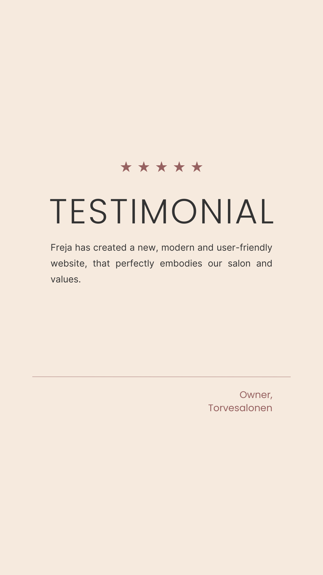 Torvesalonen wanted a modern, welcoming website that reflected their inclusive values and professional warmth. The goal was to simplify their digital presence without losing the character their clients loved. I combined strategic design, storytelling, and user-friendly development in one cohesive process. After interviewing staff and analyzing their clientele, I built a clean, intuitive website using warm tones, soft transitions, and authentic imagery. Fonts like Raleway and Lato added elegance and readability, while responsive structure ensured easy booking and navigation. The result feels both minimal and human — just like the salon itself.